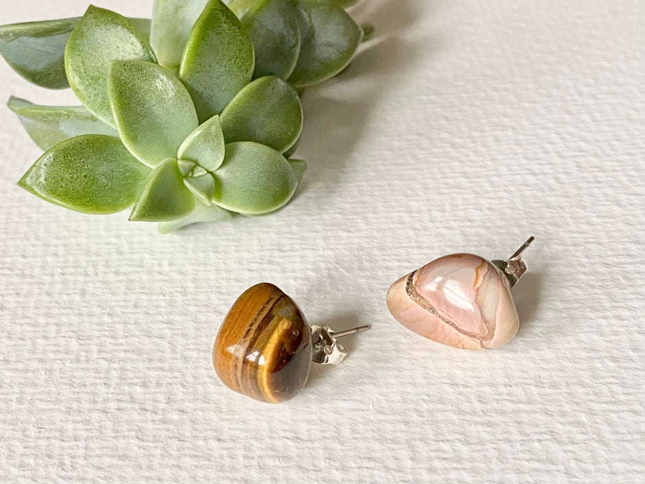 Tiger Eye and Botswana Pink Agate stud crystal ethnic quirky earrings