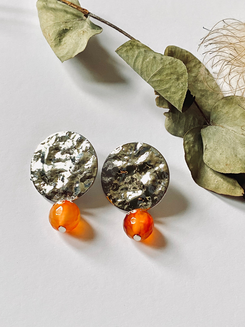 silver plated hammered ethnic disc earrings with orange Carnelian Crystal Beads