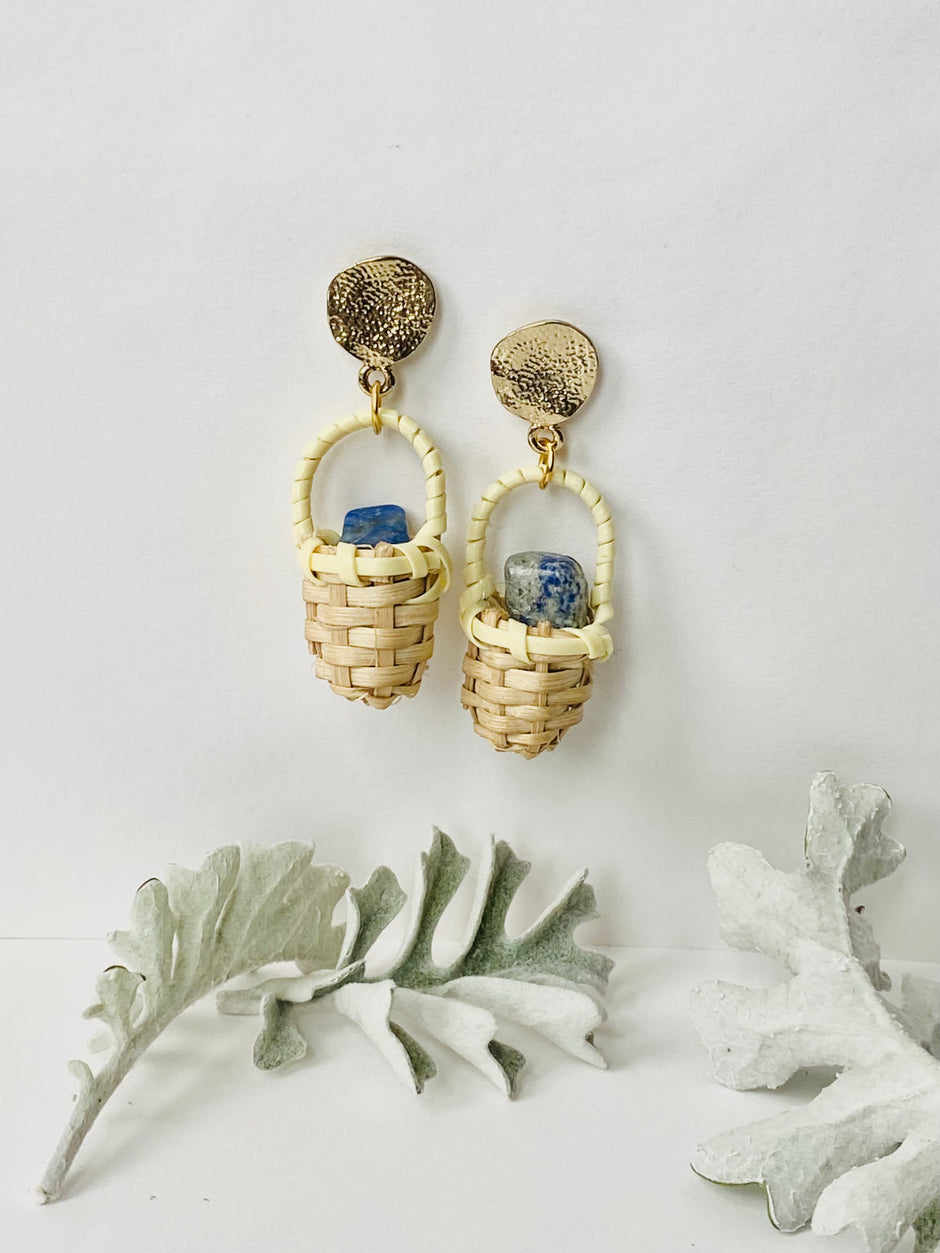 Woven rattan mini basket blue lapis lazuli quirky earrings