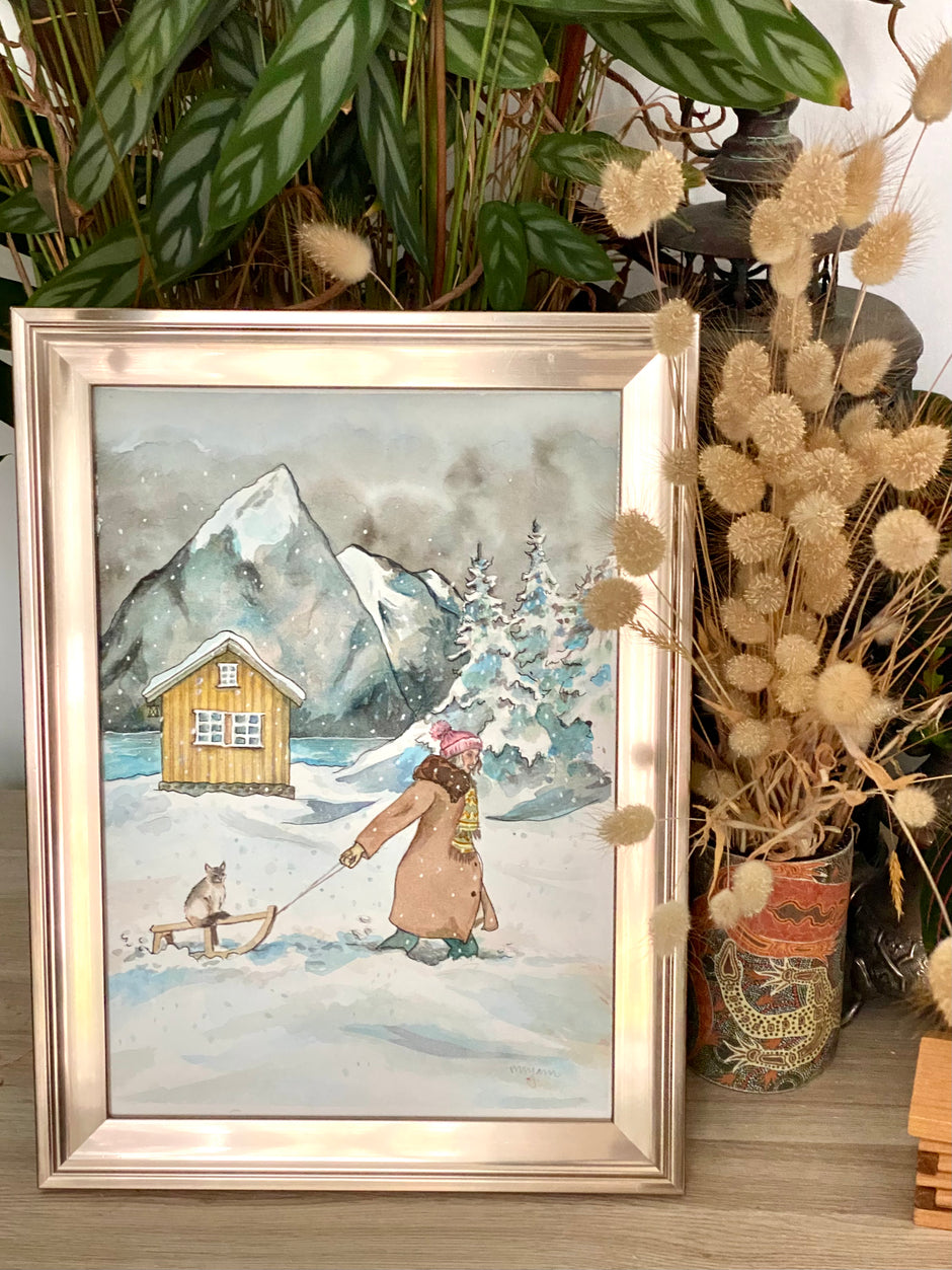 Through the snow - original watercolour painting of a girl pulling a Ragdoll cat on a sledge in the snow