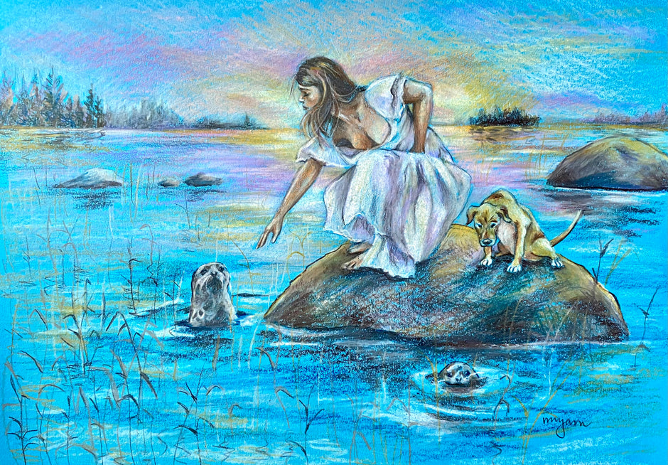 Lake Saimaa, original blue colour pencil drawing of a woman and a dog by a sunset lake in Finland with ringed seals. Original art