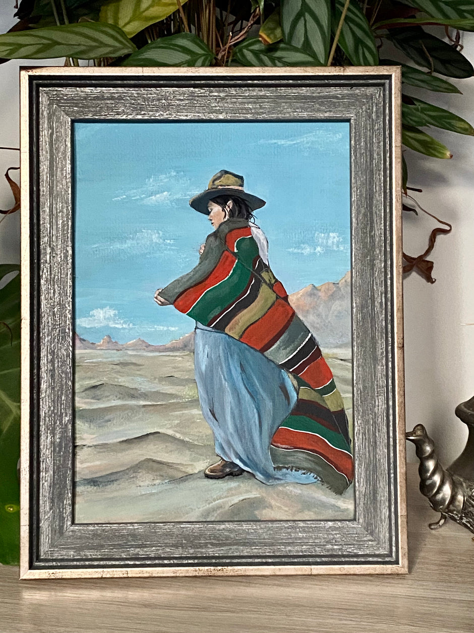 Desert wind, original gouache fine art illustration of a woman shaman in the desert. Mexican South American folk art.