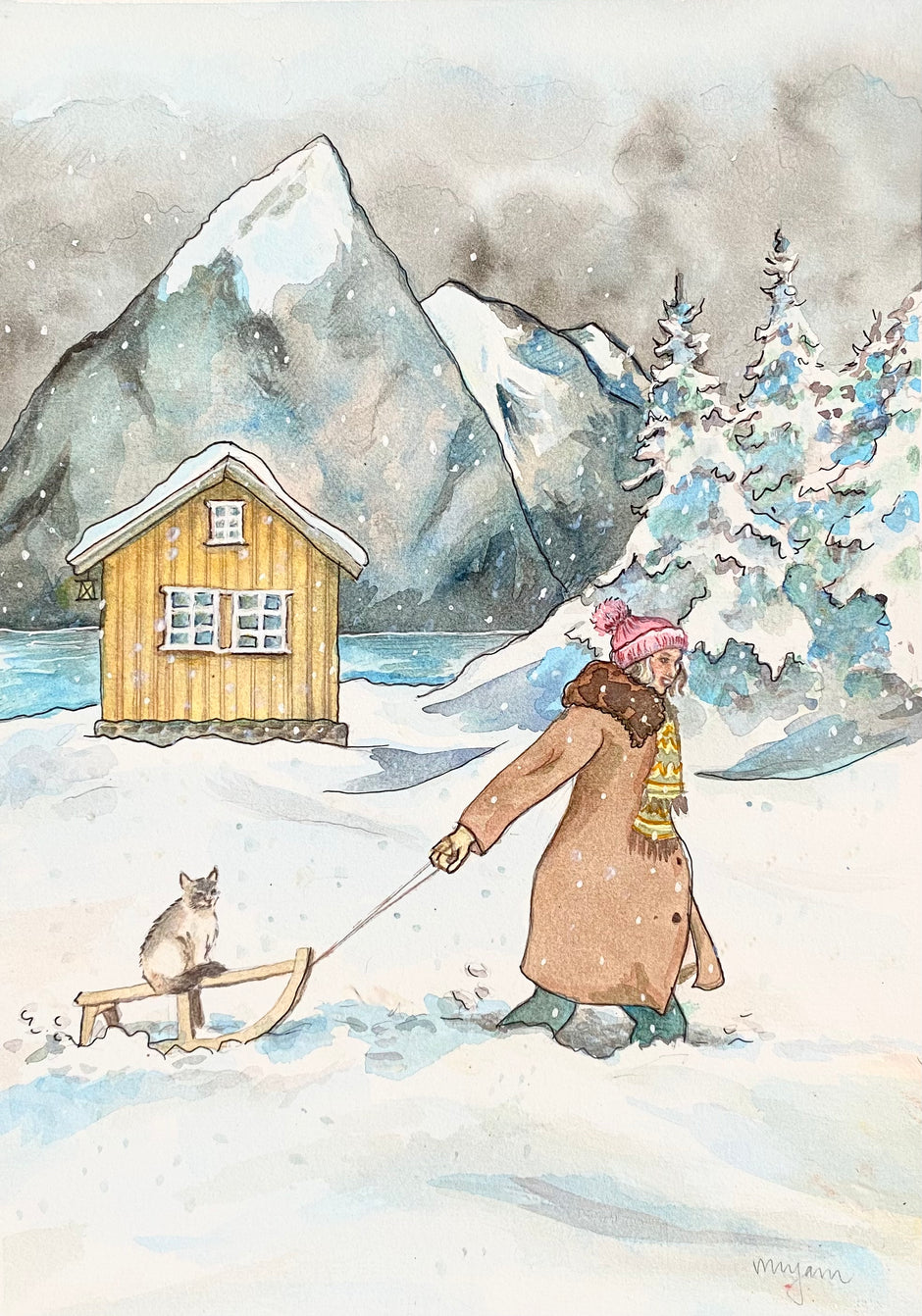 Through the Snow - a giclee print of a girl pulling a Ragdoll cat in snow in wintery landscape