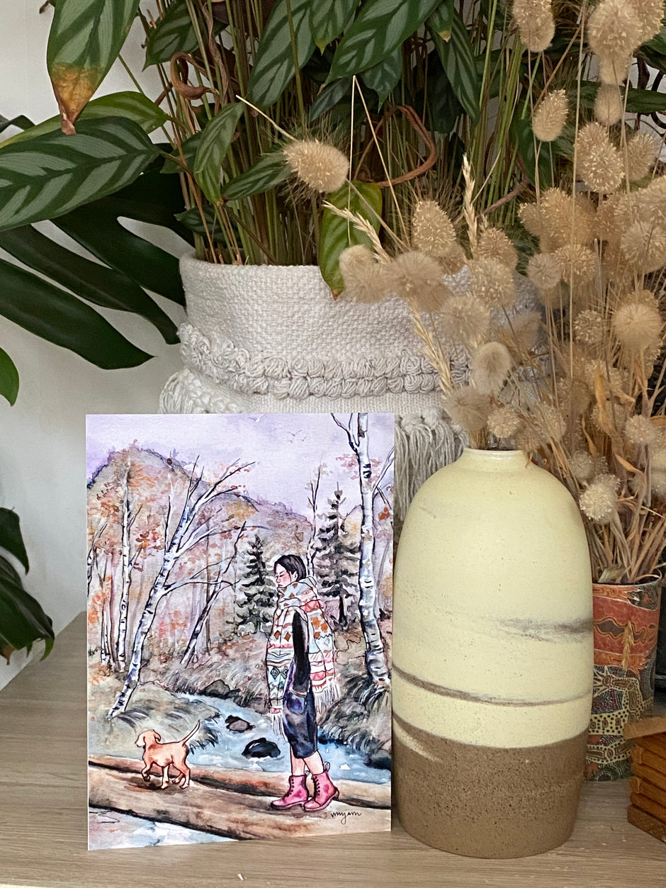 river Crossing - watercolour painting print of a woman and a dog walking in Autumnal Forest