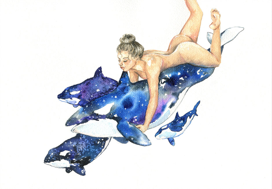 Orcas - a watercolour giclee art print of a nude woman riding on orcas