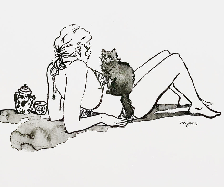 Sunbathing - ink illustration watercolour watercolor black and white painting print of a cat and a woman