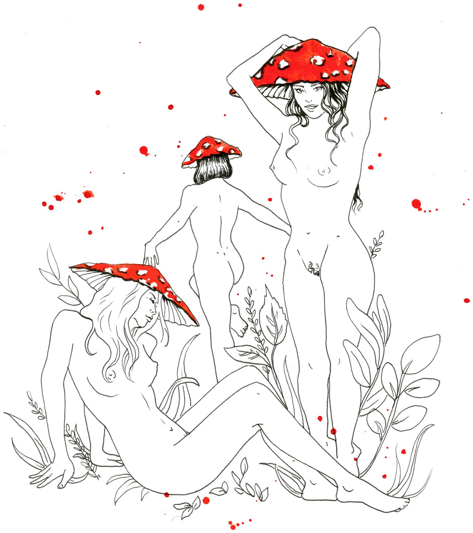 Wildlings, ink illustration print of a nude mushroom fairies