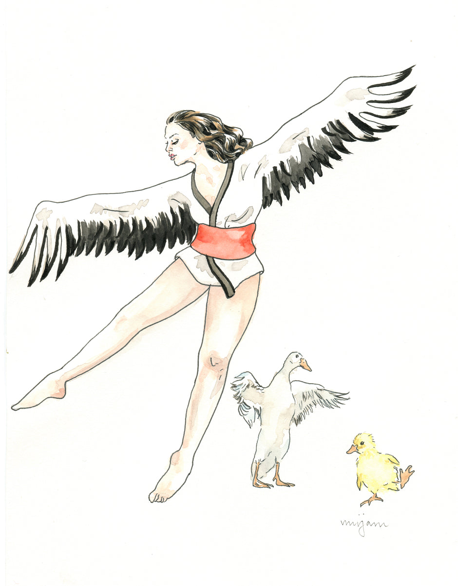 Spring Dance , original watercolour print of a dancing woman , Indian runner duck and a duckling