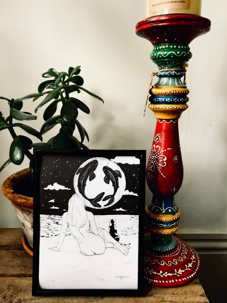 Pisces Moon -black and white print of a nude woman, cat and the moon