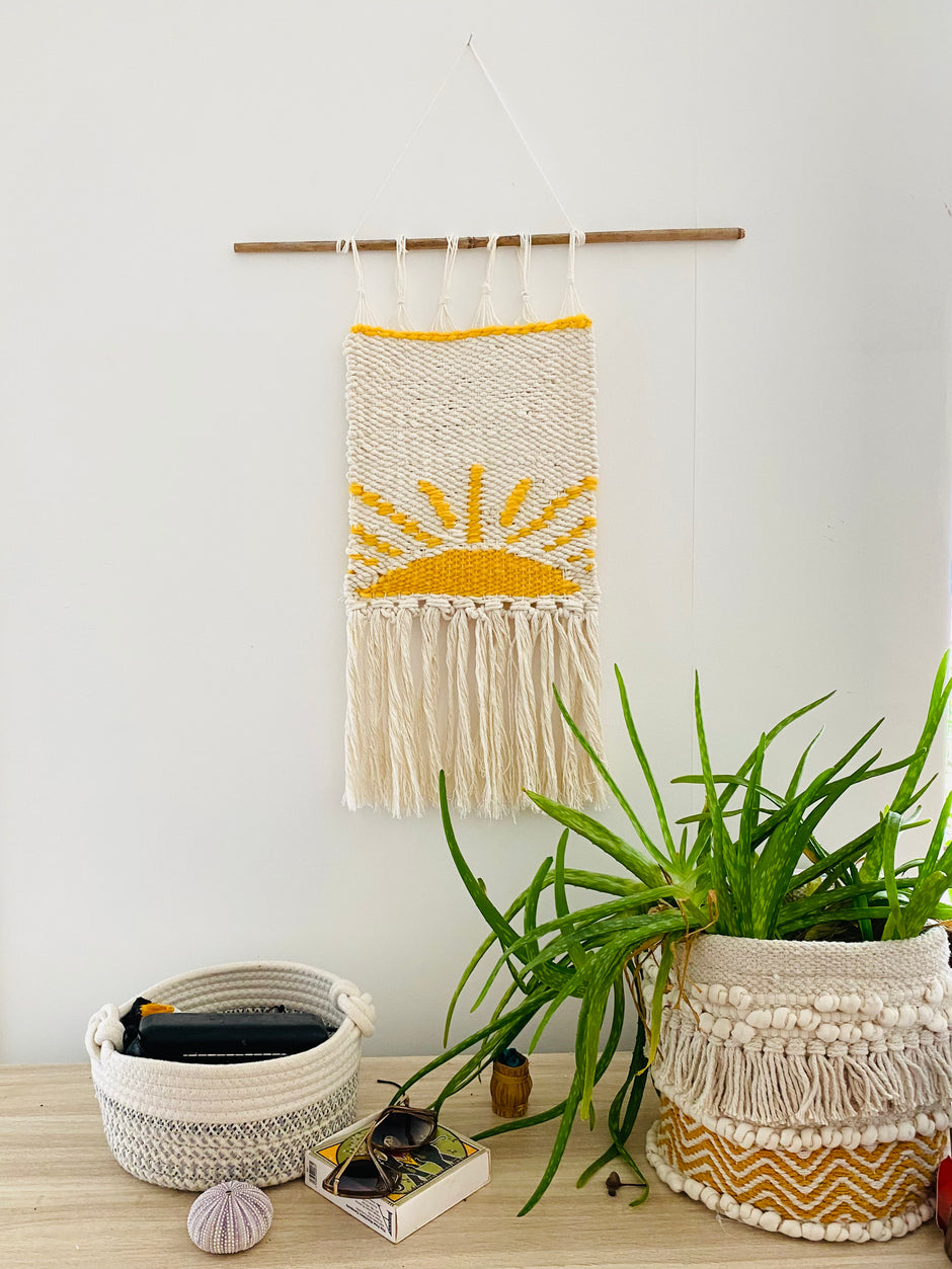 Sunshine Folk , cream white yellow sun wall hanging