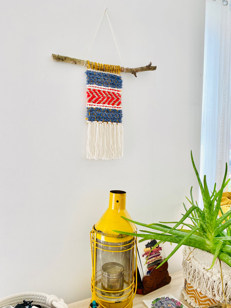 Rustic Folk , cream white blue red folklore tapestry weave rug wall hanging macrame tassel with contrasting colours. Decorative item