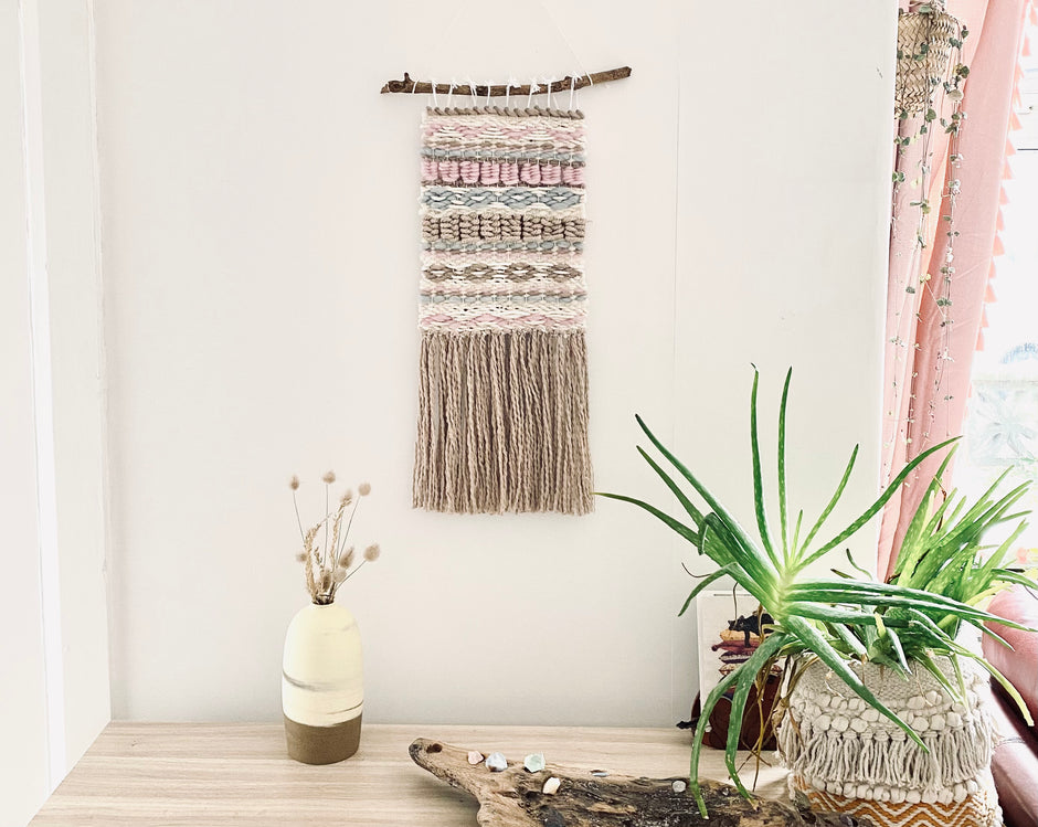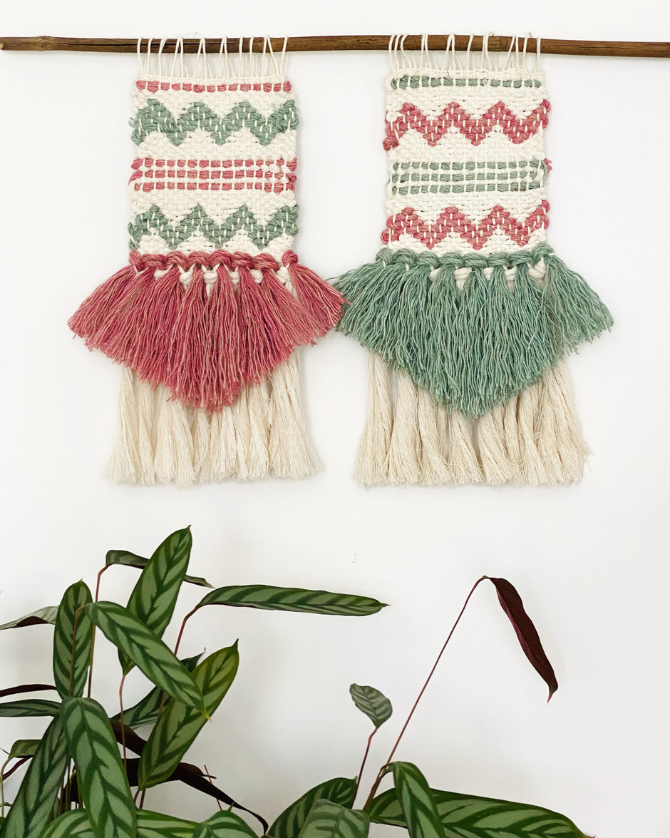Rose Garden Folk , cream white rose pink sage green duo wall hanging tapestry weave rug macrame. A gift for a twin,sister, sibling , friend
